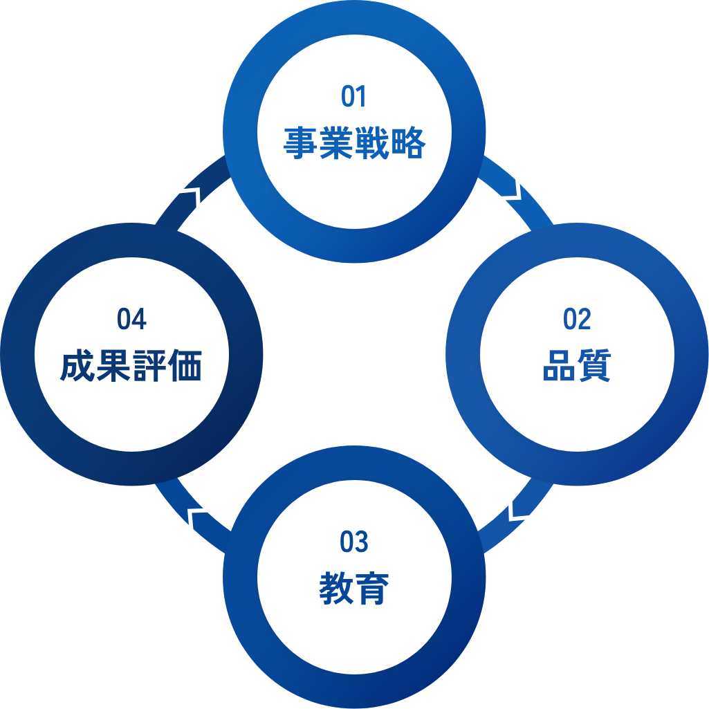 「事業戦略・品質・教育・成果評価」。4つのファンクションをバランスよく着実に機能させることで、持続的な成長を実現。